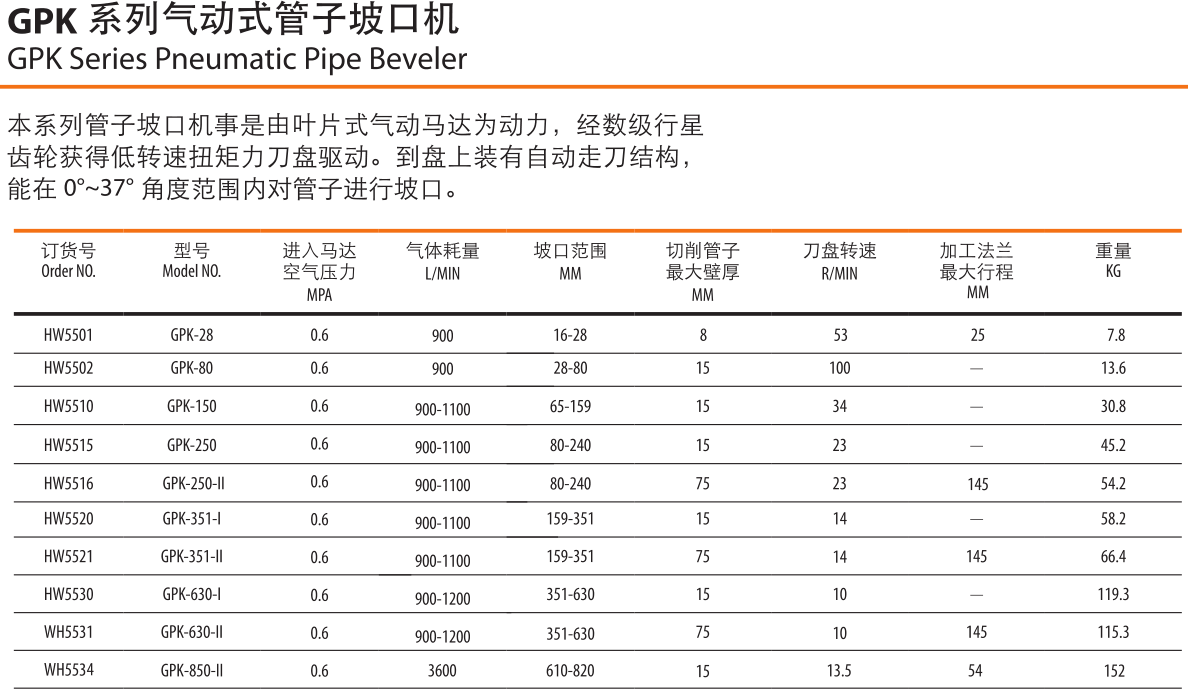 GPK系列坡口機專為鋼管的倒角、焊接坡口的切削而設計。其采用氣動馬達作為動力,內漲式結構,自動定位鋼管中心,操作方便。本機可對鋼管進行倒角、焊接坡口及法蘭平面進行加工。無論管壁厚薄,其加工性能與效率比起傳統工藝都有著不可替代的優勢。